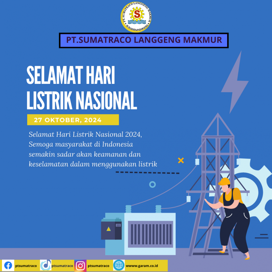 www.garam.co.id.Suravaya 27 oktober 2024 PT Sumatraco Langgeng Makmur, perusahaan garam terkemuka di Indonesia, turut merayakan Hari Listrik Nasional dengan mengapresiasi peran penting energi listrik dalam proses produksi garam. Listrik yang andal menjadi kunci dalam mengoperasikan berbagai mesin dan peralatan modern yang digunakan dalam proses pengolahan garam, mulai dari tahap penguapan air laut hingga pengemasan produk akhir.